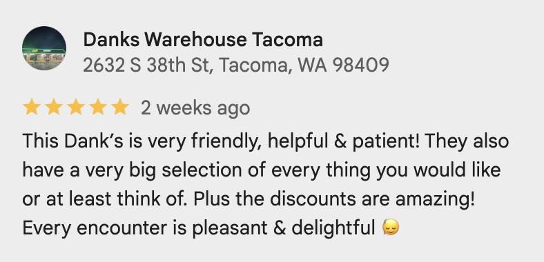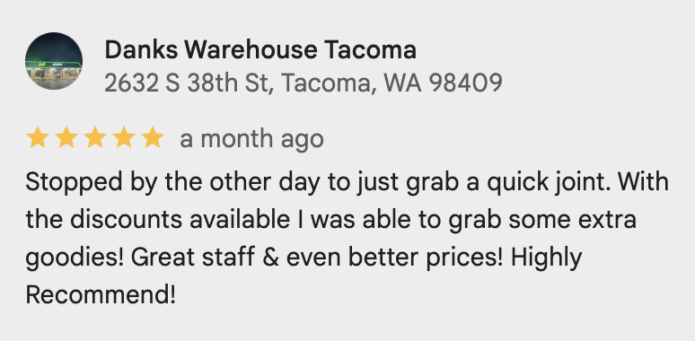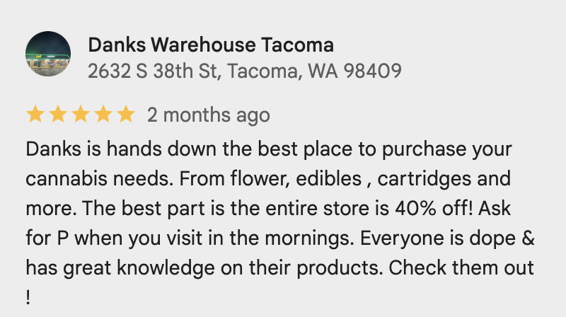 Dank’s Warehouse Tacoma is our second newest cannabis dispensary, conveniently located just down the street from the Tacoma Mall. Open seven days a week from 8:00 AM to 11:55 PM, we’re proud to serve the Tacoma community with premium cannabis products at the best prices in town.